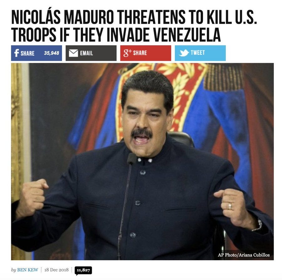 Venezuela President Nicolas Maduro: “It was not true that there were WMDs in Iraq. It’s not true what they’re saying about drug trafficking in Venezuela.” Venezuela has the world’s largest oil reserves (303 billion barrels). That’s the real reason the U.S. is starting this war.